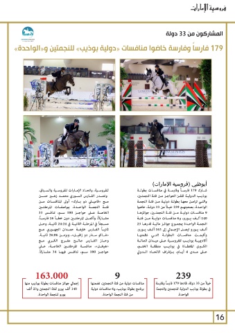 مشــاركاً ،وأكمــل المرحلتــن دون خطــأ 16فارســاً، الواحـدة ،بصحبتهـم 239خيـاً من 33دولـة ،خاضوا