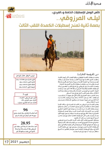 ديسمبر 17 2021 وبخــاف التتويــج بالمركــز الأول ،فقــد كانــت الفارســة ليــى المرزوقــي
