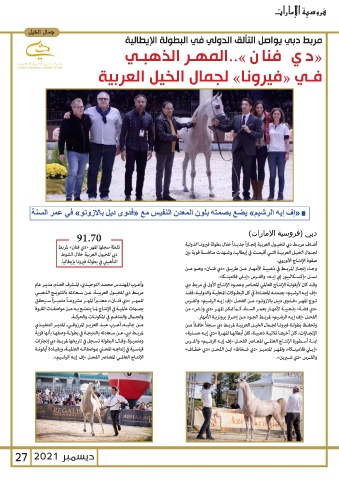 نقطة سجلها المهر «دي فنان» لمربط أضـاف مربـط دبي للخيـول العربية إنجـازاًجديـداًخلال بطولة فيرونـا الدولية