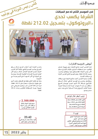 صهــوة «بوبــا» لإســطبلات المغاويــر ونــال 181.21 الماراثــوني لمســافة 155كلــم ،ضمــن مهرجــان الشــيخ