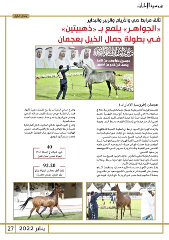 لبطولة عجمان لجمال الخيل. القاسـمي ،عـى الفضيـة ،ونالـت البرونزية «عـروس البداير» للشـيخ محمد