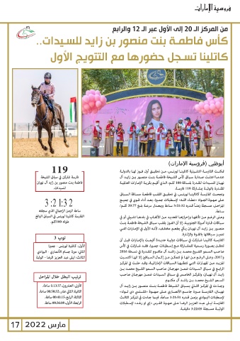 فارسة شاركن في سباق الشيخة تمكنـت الفارسـة التشـيلية كاتلينـا لورنـس ،مـن تحقيـق أول فـوز لهـا بالدولـة
