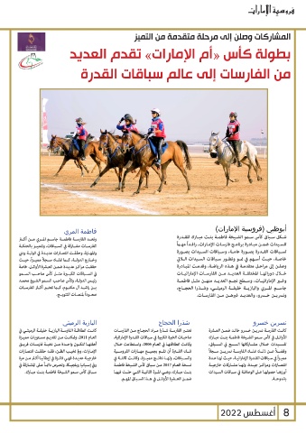 الفارســات مشــاركة في الســباقات ،وتتميــز بالحنكــة شـكل سـباق كأس سـمو الشـيخة فاطمـة بنـت مبـارك للقـدرة