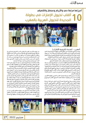 الإماراتيـة لعـدم وجـود طائـرات شـحن مبـاشرة إلى المغـرب» .وثمن جهود وحصـدت «ع .ج براكـة» لمربـط عجـان ،اللقـب الذهبـي لبطولـة الأفـراس،