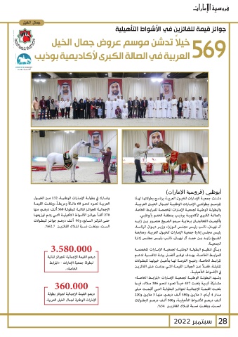 الإجماليـة للجوائـز الماليـة للبطولـة 360ألـف درهـم ،منها دشـنت جمعيـة الإمـارات للخيـول العربيـة برنامـج بطولاتهـا لهـذا