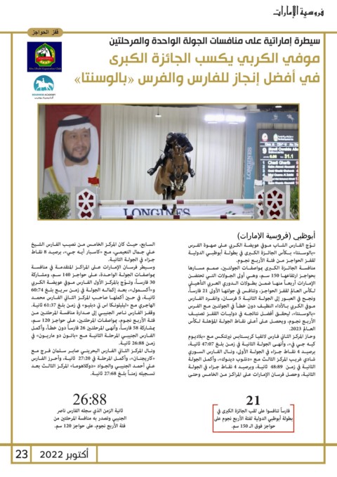 بمشـاركة 58فارسـاً ،وأنهـى المرحلتـن 26فارسـاً دون خطـأ ،وأكمـل «بالوســنتا» ،ليحقــق أفضــل نتائجــه في دوليــات القفــز تصنيــف