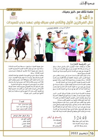 180ألـف درهـم ،والثالـث 160ألـف درهـم ،فيما تنـال صاحبات صهـوة الفـرس «النيـز جميلـة» ،قاطعـة المسـافة الكليـة بزمـن قـدره