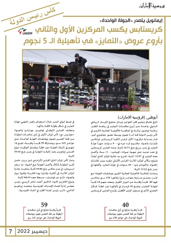 حواجــز 145ســم ،وبمشــاركة 59فارســاً وفارســة ،نجــح 14 فــاز بصــدارة مركزيهــا :الأول فــارس لاتفيــا كريســتابس نيرتنكــس