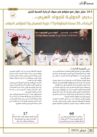 دبي للخيـول ،أقيمـت فعاليـات النسـخة الخامسـة مـن مؤتمـر وشـهد المعـرض مشـاركة أكـر مـن 60عارضـاً مـن 35دولـة ،ويشـكل