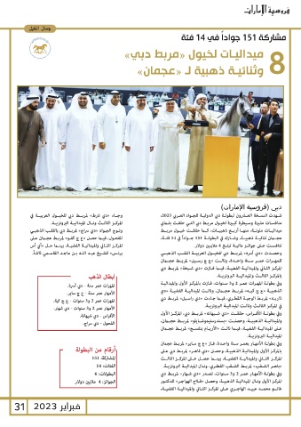 للفحـول ،فيـا حصـل «ع ج كفـو» لمربـط عجـان عـى ميداليــات ملونــة ،منهــا أربــع ذهبيــات ،كــا حققــت خيــول مربــط