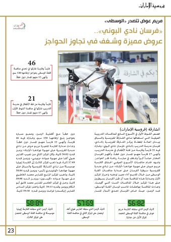 57:69ثانيـة ،فيـا ذهـب المركـز الثالـث إلى الفارسـة إيميليـا وأنهــى 17فارســاً منهــم المســار دون خطــأ ،وأظهــز الفرســان