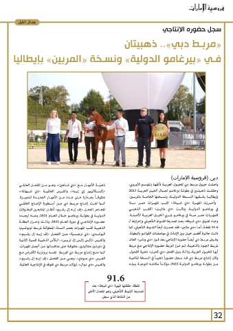 والفـرس «دي نـوال» ،ليؤكـد مربـط دبي تفوقه في الإنتاجيـة العالمية. أبهـا للخيـول العربية ،وذلـك بنيل الفحل «دي كحيـل» ذهبية الفحول.