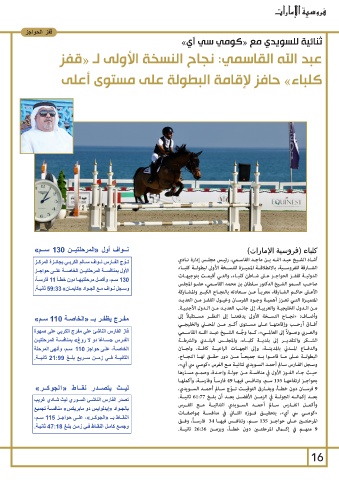 130سـم ،وأكمـل مرحلتيهـا دون خطـأ 11فارسـاً، الدوليــة لقفــز الحواجــز عــى شــاطئ كلبــاء ،والتــي أقيمــت بتوجيهــات