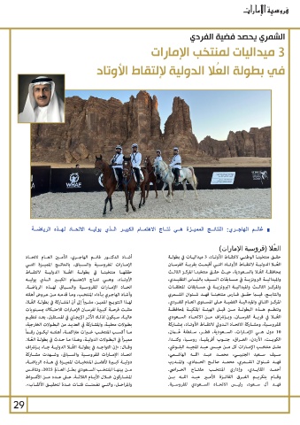 اتحــاد الإمــارات للفروســية والســباق لهــذه الرياضــة. بمحافظـة ال ُعـا بالسـعودية ،حيـث حقـق منتخبنـا المركـز الثالـث