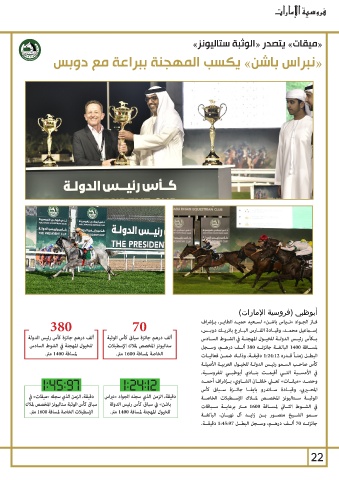 ألف درهم جائزة كأس رئيس الدولة ألف درهم جائزة سباق كأس الوثبة فـاز الجـواد «نـراس باشـن» لسـعيد حميـد الطايـر ،بـإشراف