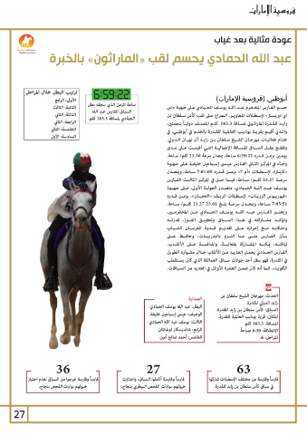 الأولى :الرابع ساعة الزمن الذي سجله بطل حسـم الفـارس المخـرم عبـد اللـه يوسـف الحـادي عـى صهوة «اس