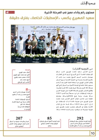 الحدث :مهرجان صاحب السمو لمســافة 101كلــم ،بمشــاركة كبــرة بلغــت 292فارســاً وفارســة.
