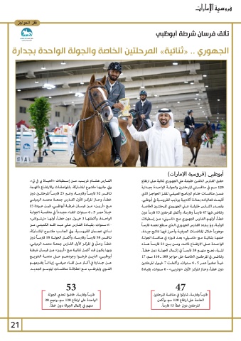 الواحــدة ،وأكملتهــا 3خيــول دون خطــأ ،أولهــا «نيشــولاس» وتصــدر الفــارس خليفــة عــي الجهــوري المرحلتــن الخاصــة
