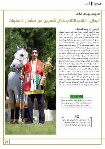 بلغــت مشــاركات الفــارس ذيــاب البلــوشي 32ســباقاً ،حقــق