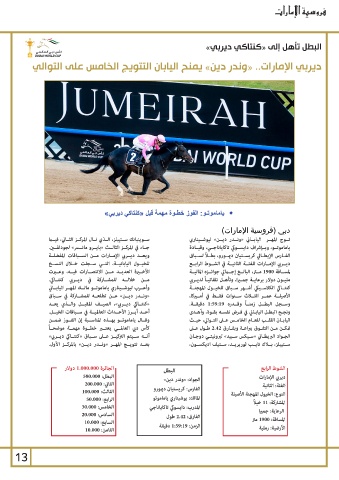 ويعــد ديــربي الإمــارات مــن الســباقات المفضلــة تــوج المهــر اليابــاني «ونــدر ديــن» ليوشــيناري
