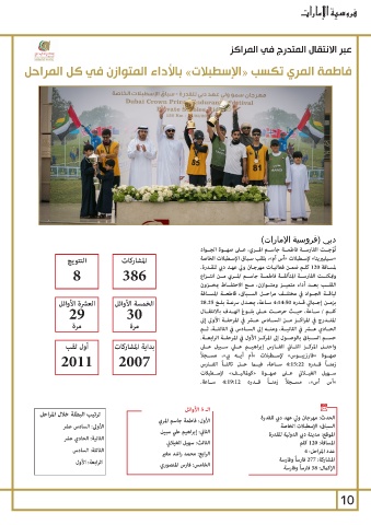 العشرة الأوائل29 الخمسة الأوائل30 تُ ّوجــت الفارســة فاطمــة جاســم المــري ،عــى صهــوة الجــواد