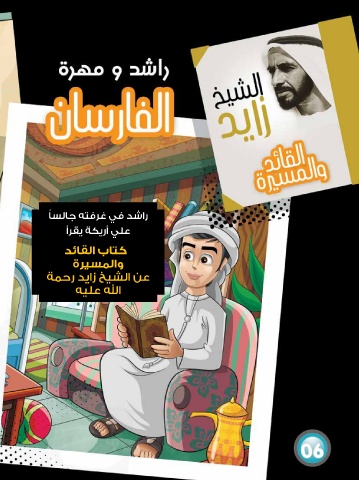 راشد في غرفته جالس ًا علي أريكة يقرأ كتاب القائد والمسيرة عن الشيخ زايد رحمة الله عليه